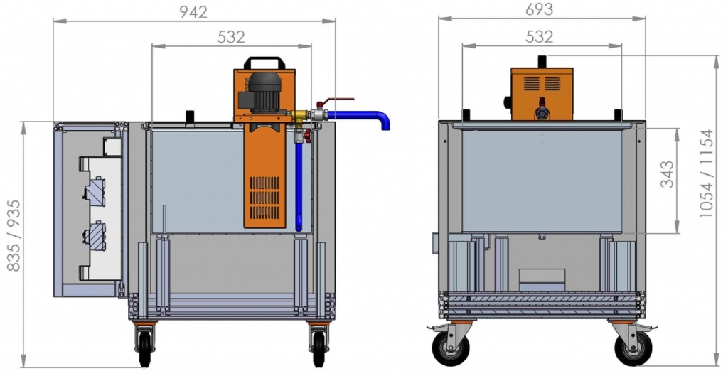 - TOTAL DIMENSIONS AND WEIGHT: Without Pump L. 970 X W. 700 X H. 890 mm - Weight: 90 Kg. – With Pump L. 970 X W. 700 X H. 1.100 - Weight: 105 Kg.