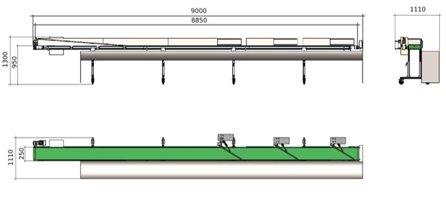 • INGOMBRI E PESI TOTALI6 MT L 6.300 x W 800 x H 1.400 mm - Peso: 210 Kg. - 9 MT L 9.300 x W 800 x H 1.400 mm - Peso: 240 Kg. - 12 MT L 12.300 x W 800 x H 1.400 mm - Peso: 280 Kg.