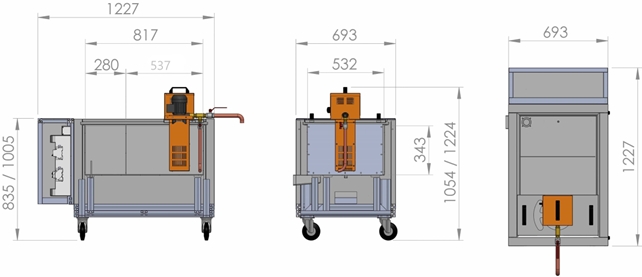 • INGOMBRI E PESI TOTALI MACCHINA: Senza Pompa L. 970 X W. 700 X H. 990 mm -  Peso: 100 Kg.  -  Con Pompa L. 970 X W. 700 X H. 1.200 - Peso: 140 Kg.